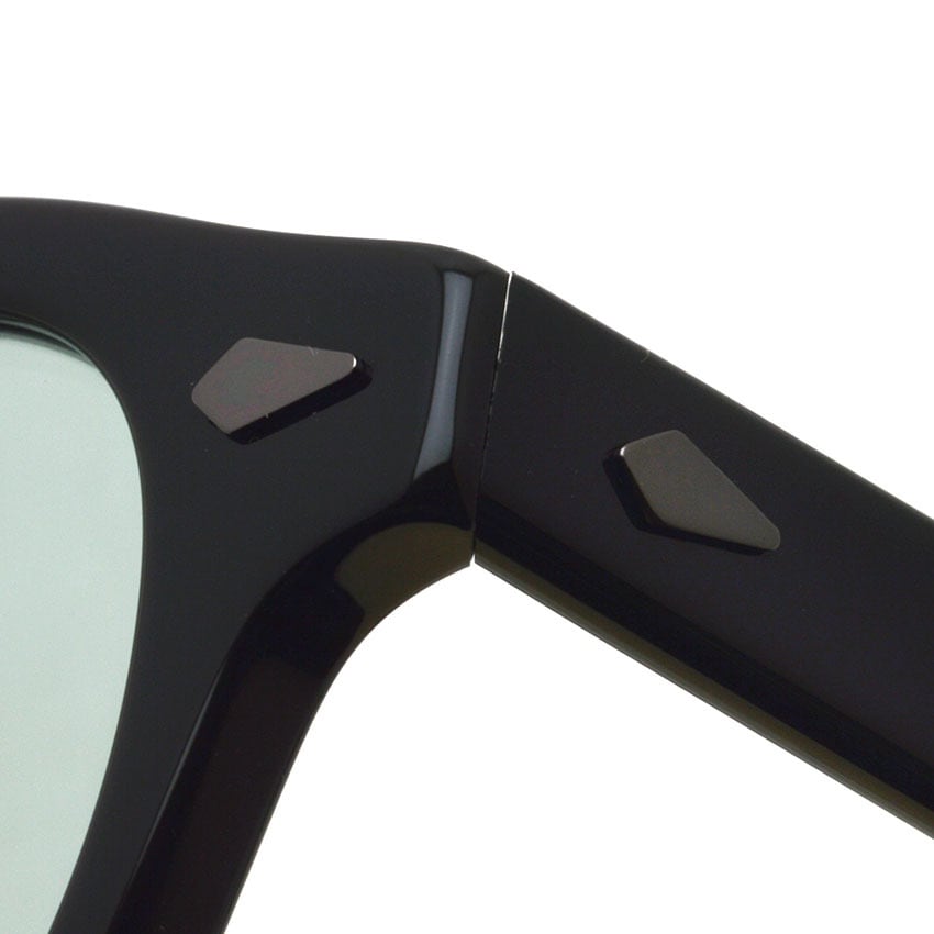 サングラスモデルは、シックなブラックのフレームに淡い色彩のガラス製グレーカラーレンズを合わせた。