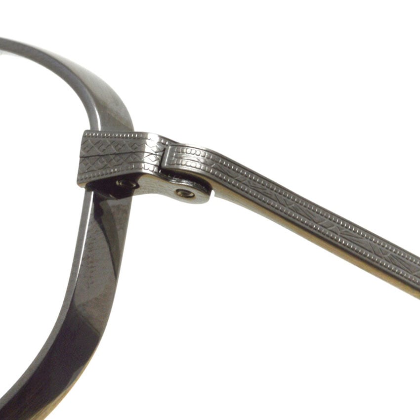 わずかに厚みをもたせたオリジナルリムに、丁番の内側にまで装飾が施された職人の手掘りマスターによるヨロイ、そして繊細な模様を刻んだチタンテンプルを組み合わせ、柔らかな曲線を描くブリッジで全体をまとめている。