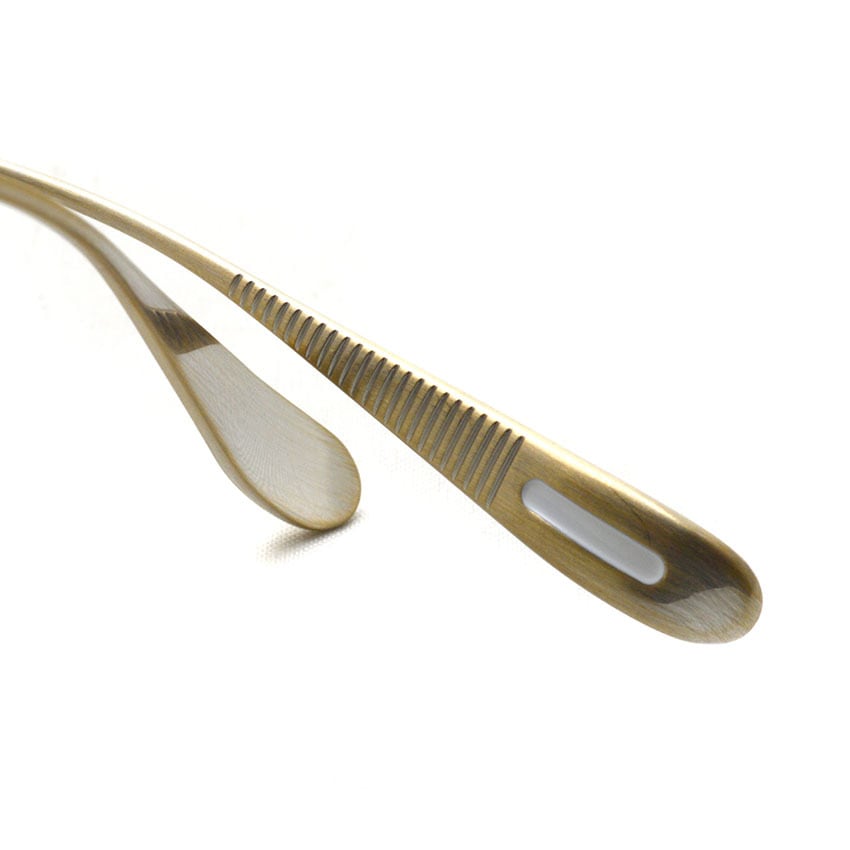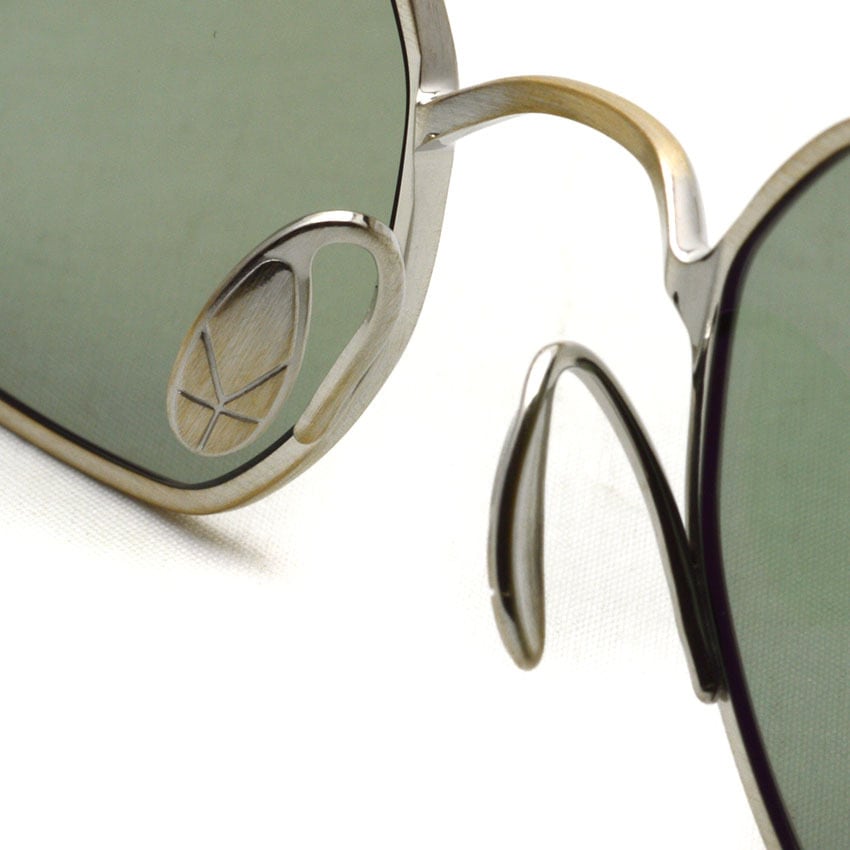フロントからヨロイ、テンプルへと繋がる丸みと平面の組み合わせはチタン素材の持つ表情を引き出し、自然と顔に馴染む造形美を表現。