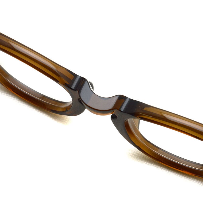 フチは太めに設定するも丸く、ブリッジは通常より高く仕上げ、フロント両端のカシメは3点(スリードット)を採用しクラシックな印象に。