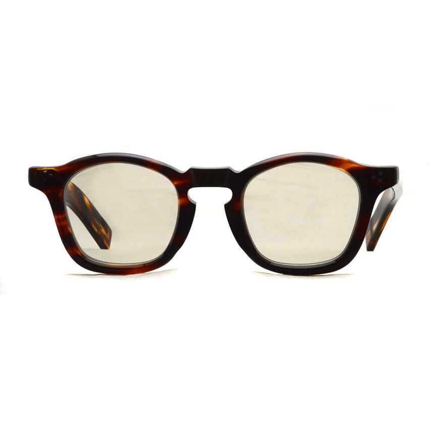 フチは太めに設定するも丸く、ブリッジは通常より高く仕上げ、フロント両端のカシメは3点(スリードット)を採用しクラシックな印象に。