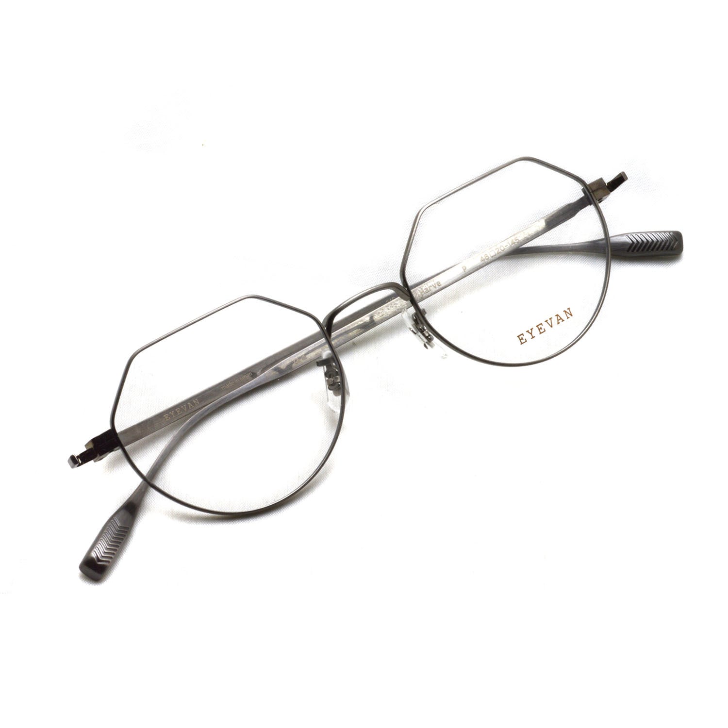 1920年代のアメリカ製3ピース(リムレス)フレ ームに見られた特徴的なレンズシェイプと、エングレービング(彫金加工)を全てのパーツから排除したミニマルなルックがEYEVANらしいニューヴィンテージデザインに仕上がった。