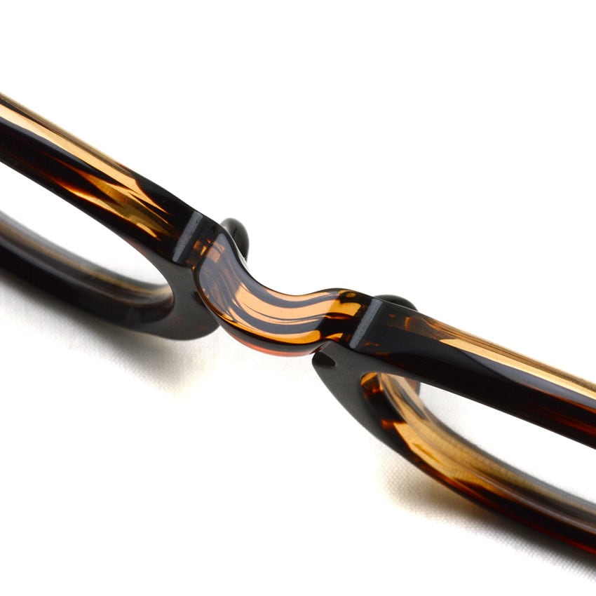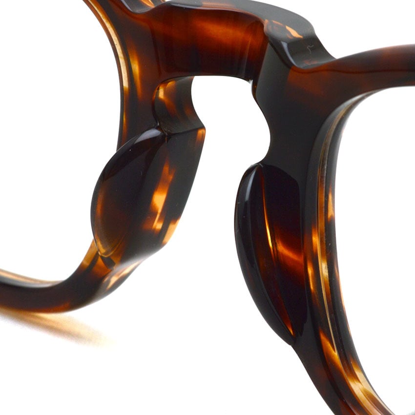 サイズアップしましたが、"gp-05"同様、フチは太めに設定するも丸く、ブリッジは通常より高く仕上げ、フロント両端のカシメは3点(スリードット)を採用しクラシックな印象に。